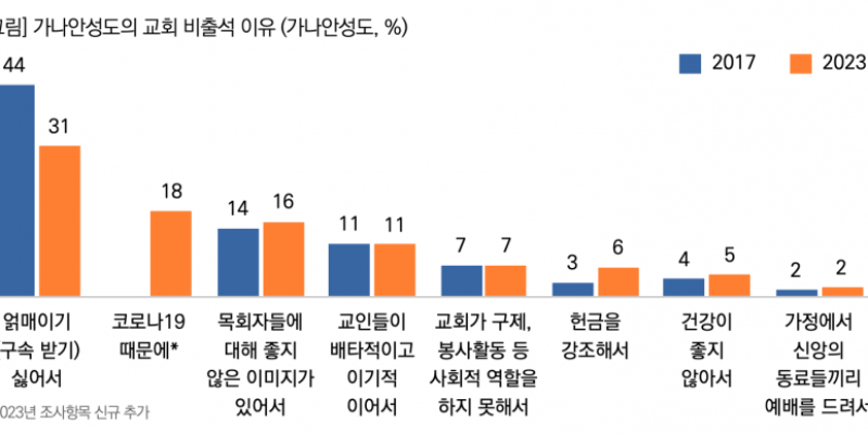 이번에 발표된 주요 내용 중에는 개신교인 중 가나안성도가 2012년 11%에서 2023년 29%로 크게 증가했는데, 이러한 가나안성도 급증세가 주목된다. 가나안성도들의 교회 비출석 이유에 대한 응답내용은 ‘얽매이기 싫어서’가 3명 중 1명꼴(31%)로 가장 높았고, 이어 ‘코로나19 때문에’, ‘목회자들에 대해 좋지 않은 이미지가 있어서’, ‘교인들이 배타적이고 이기적이어서’ 등의 순으로 2023년도에 ‘코로나19 때문에’는 보기로 새롭게 제시했는데 이 요인이 전체 2번째로 응답되어 가나안성도 급증에 코로나 요인이 크게 작용했음을 알 수 있다.