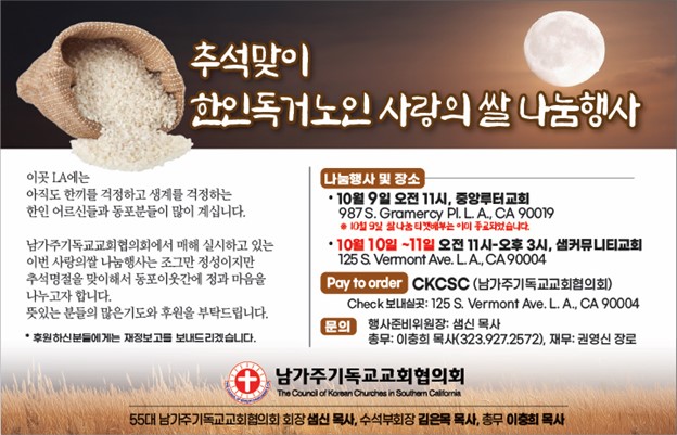 남가주기독교교회협의회(회장 샘신목사)는 다가오는 10월9일 부터 11일까지 한인독거노인 돕기 추석맞이 사랑의쌀 나눔해사를 개최한다고 밝혔다.