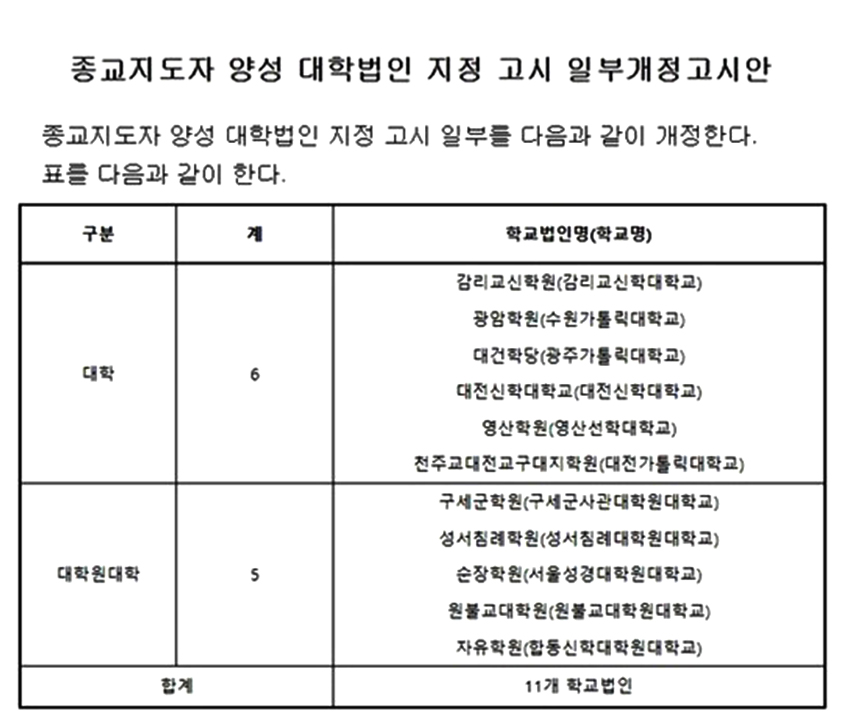 종교지도자 양성 대학법인 지정 고시 일부 개정 고시안. 출처=교육부