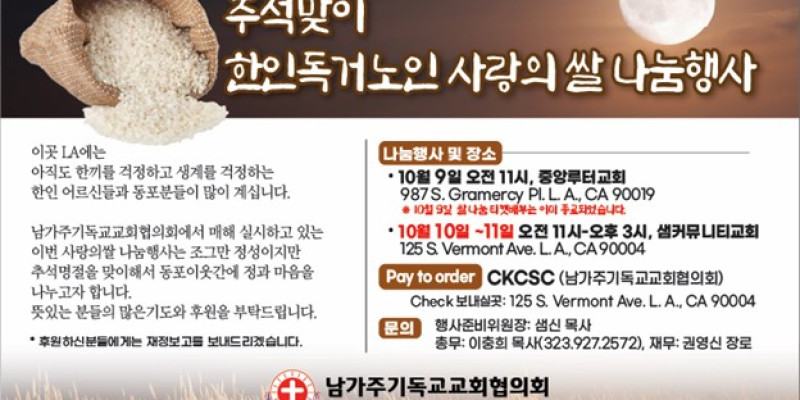 이미 쌀 나눔 티켓 배부가 종료된10월9일 목요일 오전 11시 중앙루터교회(987 S. Gramercy Pl, LA 이며 10월10일 금요일과 10월11일 토요일, 양일간은 오전11시부터 오후3시 사이, 샘커뮤니티교회 125 S. Vermont Ave. LA에서 나눔 행사가 이어진다.