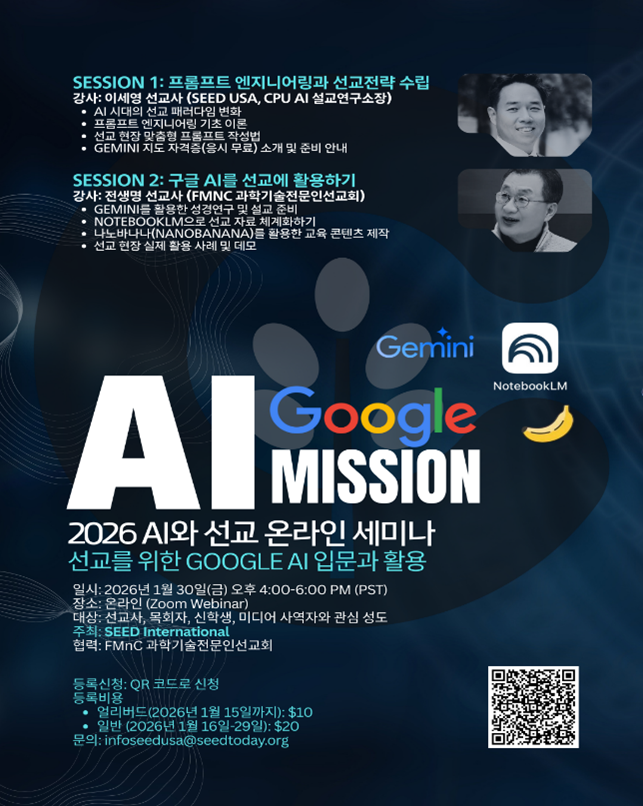 시드선교회가 다가오는 1월30일 금요일 오후 4시부터 6시(미서부시간)까지 AI와 선교 온라인 세미나를 개최한다고 밝혔다.